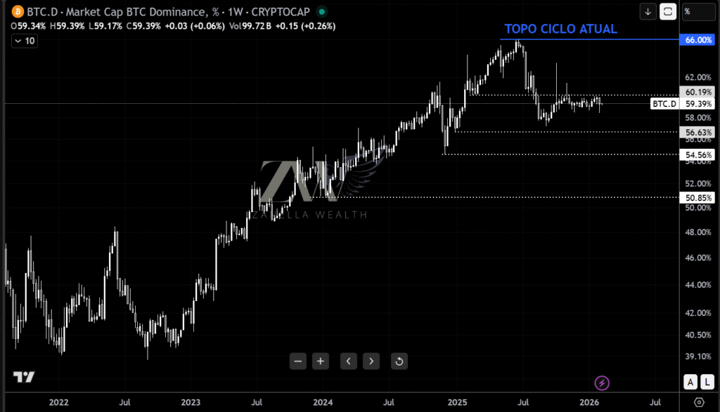 Apesar disso, a dominância do Bitcoin subiu para 58,9%. Em momentos de incerteza, o capital do ecossistema cripto busca a segurança do ativo principal. As altcoins, como o Ethereum, sofreram perdas muito mais severas, confirmando a hierarquia de risco do setor.