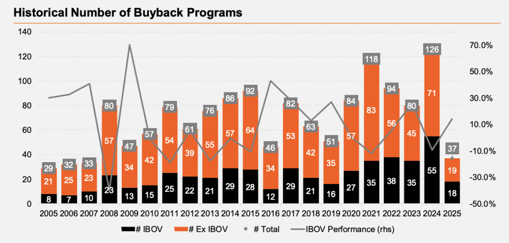 Recompra de ações: Notamos um recorde de programas de recompra (R$ 70 bilhões), especialmente nos setores financeiro e de utilities.