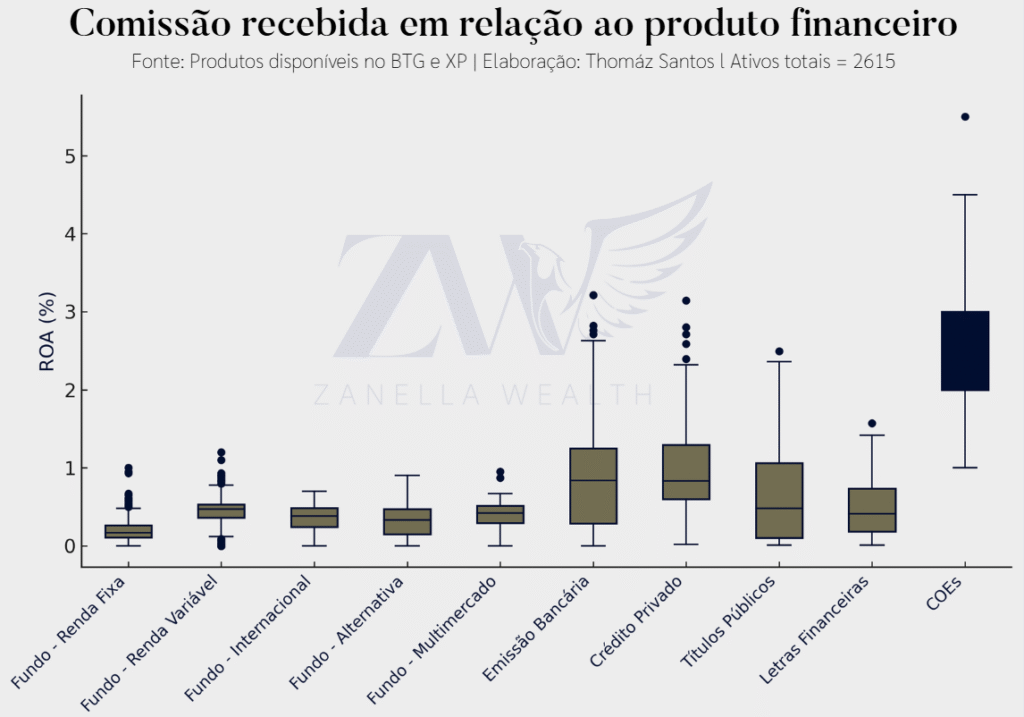 Conflito de interesses: A comissão média de um COE (3%) é até 17 vezes maior que a de outros produtos, explicando por que ele é tão empurrado pela indústria.