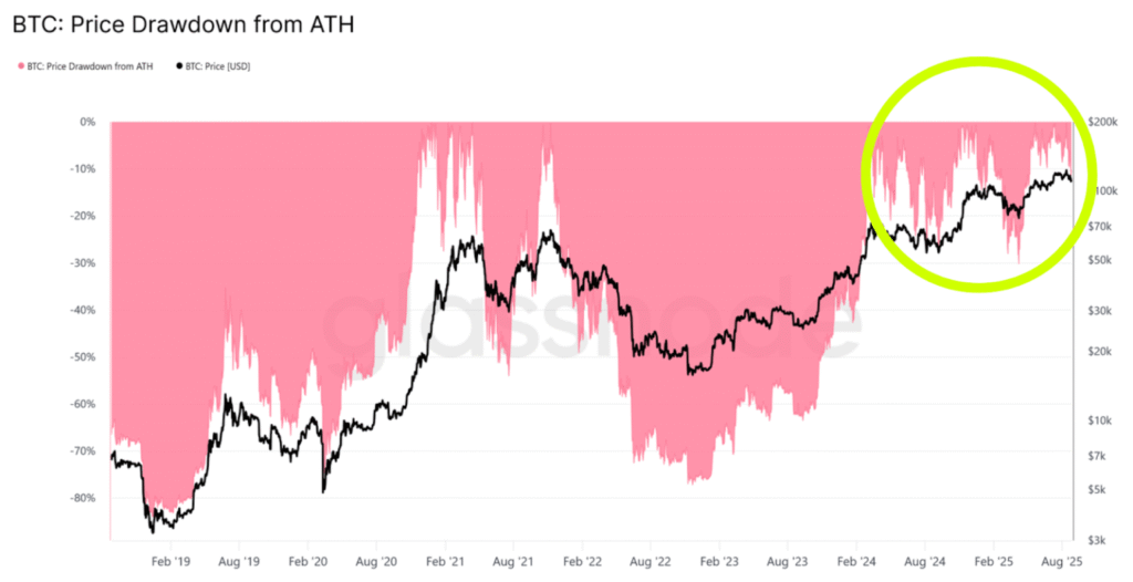 Bitcoin resiliente: O ativo encontrou suporte em US$110 mil. Analisamos o drawdown e vimos que não havia sinal de topo ou euforia excessiva (perda relativa não realizada baixa).