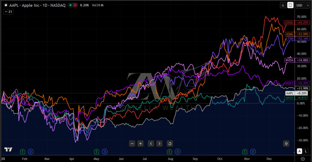 - S&P 500 (SPY): O índice subiu +14,64%, mas a disparidade entre as “Top 7” e o resto do mercado só aumentou ao longo de 2025.