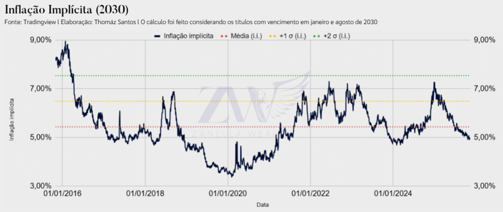 A inflação implícita: Na super quarta, o COPOM elevou a Selic para 13,25% em resposta a uma inflação resiliente, enquanto a inflação implícita para 2030 atingia 6,90%, nível um desvio padrão acima da média, abrindo uma janela de oportunidade em ativos de renda fixa prefixados. Já perto do final do ano, a inflação implícita já estava abaixo da média histórica, constatando que a nossa análise foi acertiva.
