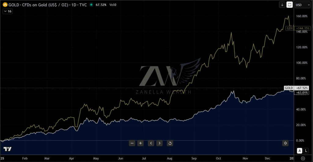 - Mineradoras (GDX): Foram o destaque absoluto com +121,75% de alta, alavancando a valorização da commodity.