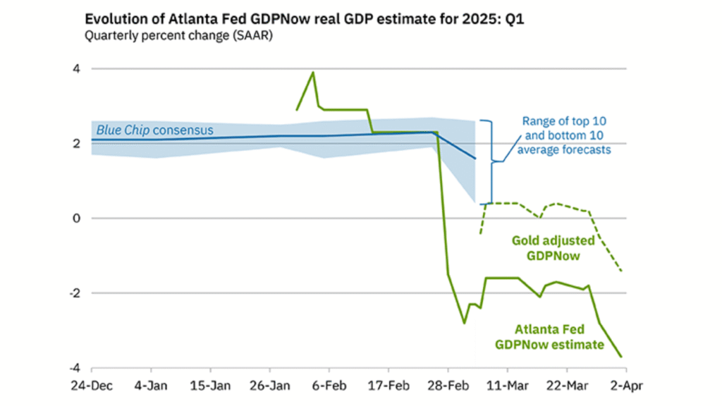 Recessão no radar: O modelo GDPNow do Fed de Atlanta sinalizou uma retração de 3% no PIB dos EUA para o Q1, contrastando com o otimismo dos analistas.