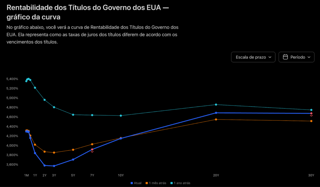 Curva de juros dos EUA: Observamos o fechamento de taxas nos vértices de 5 a 10 anos, indicando que o mercado já antecipava o fim do aperto monetário.