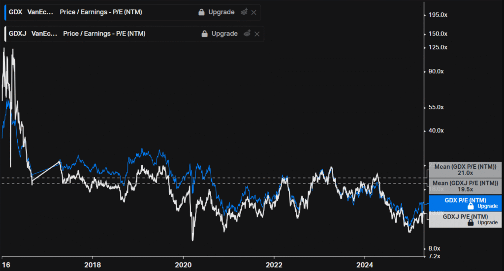Assimetria nas mineradoras de ouro: Enquanto o metal físico atingia recordes, as empresas do setor operavam com um desconto histórico. Os múltiplos Preço/Lucro projetados estavam em 13,2x para as sêniors, patamar muito inferior à média histórica de 21,0x observada desde 2016. Como resultado, fecharam o ano com um retorno histórico de 144,35%, como já mencionamos.