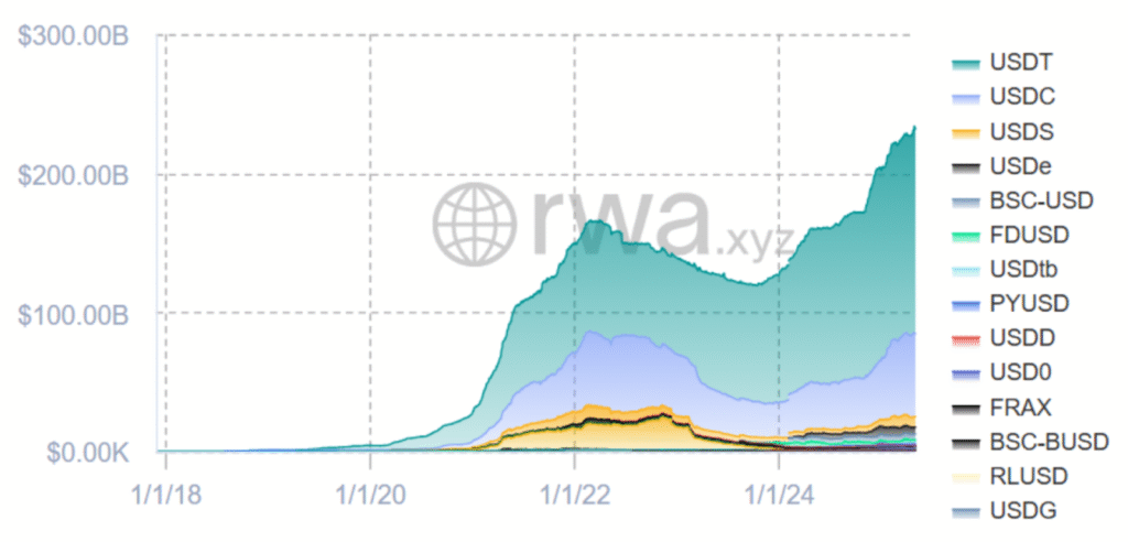 Infraestrutura global: As Stablecoins movimentaram US$15,6 trilhões em 2024, superando Visa e Mastercard e atingindo uma oferta total de US$311 bilhões em 2025.