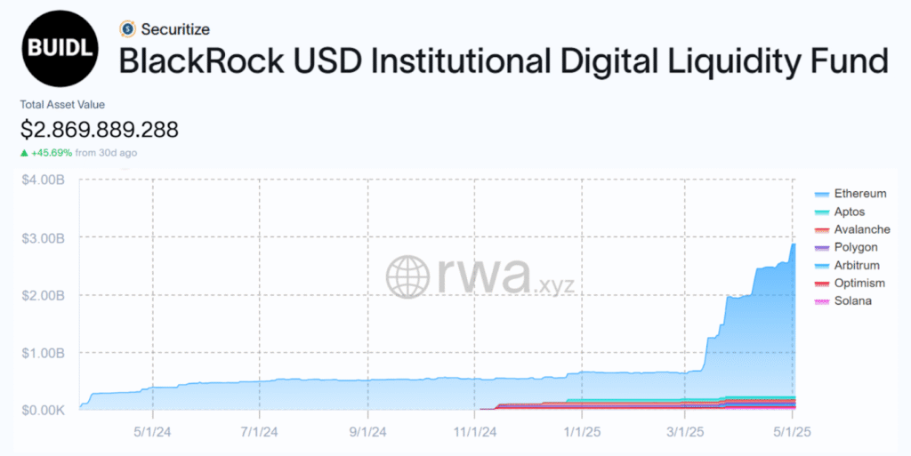 Liderança institucional: Destacamos o fundo BUIDL da BlackRock, com US$2,8 bilhões tokenizados, dos quais 91% estão na rede Ethereum.