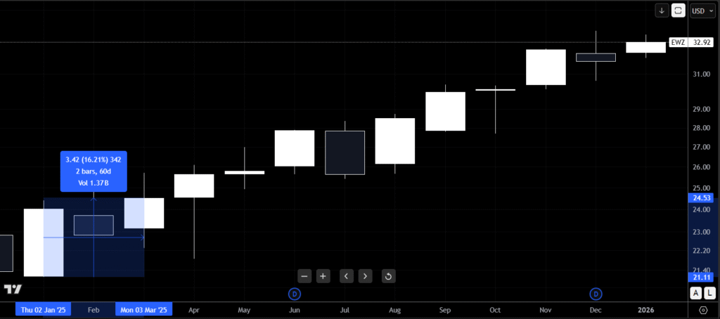 - Brasil em Dólar (EWZ): Apreciou +32,24%, beneficiado pela rotação global para emergentes que buscavam valuation descontado fora dos EUA.