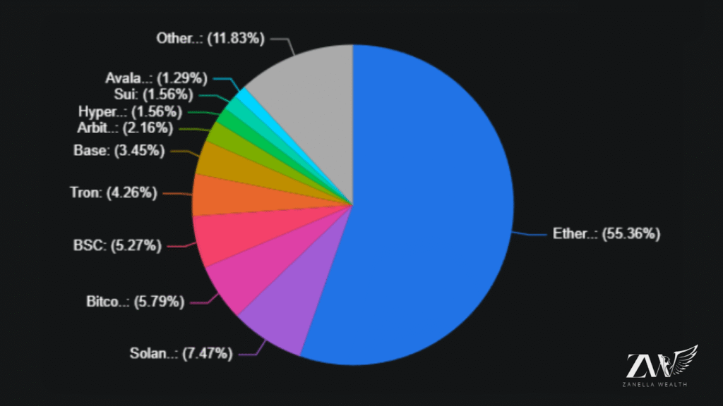 Universo DeFi: O TVL (Valor Total Bloqueado) ultrapassou os US$111 bilhões, com o Ethereum detendo 55% do mercado.