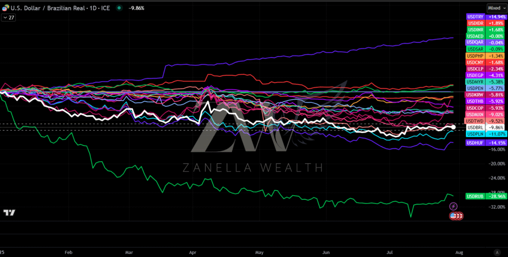 Fluxo para emergentes: O Real destacou-se como a 4ª moeda com maior valorização global no semestre (+10,1% frente ao dólar).