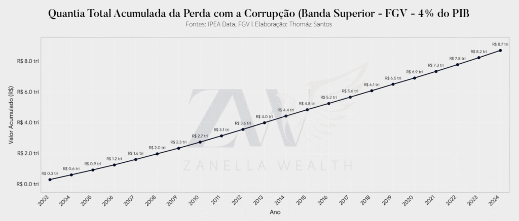O custo sistêmico: Analisamos a perda de 4% do PIB ao ano por corrupção. Desde 2003, o Brasil perdeu R$8,7 trilhões, sendo 115 vezes o valor revelado pela Lava Jato.