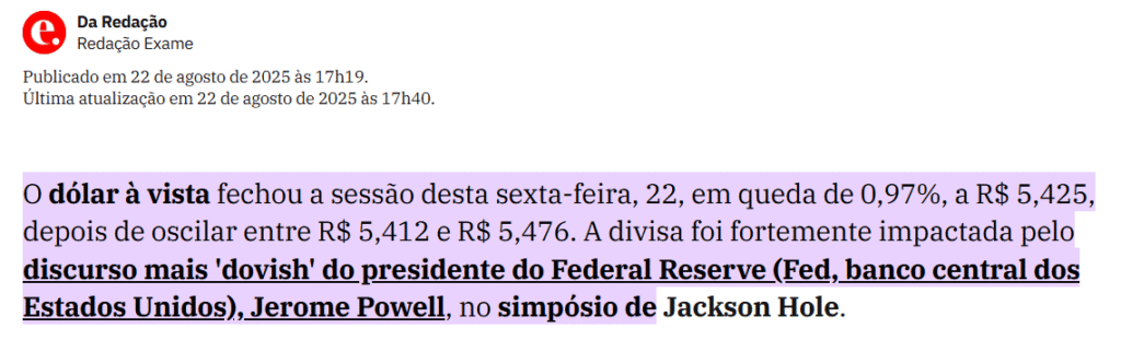 Jackson Hole: Jerome Powell adotou um tom mais dovish, sinalizando que o ajuste da postura monetária estava próximo, e que de fato se efetivou pouco tempo depois.