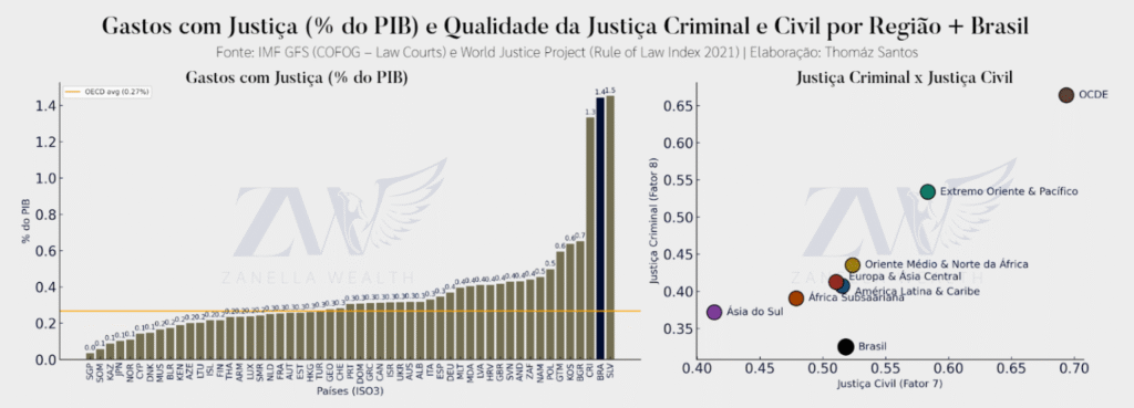 Justiça e segurança: Gastamos 5x a média da OCDE com o Judiciário e temos a maior taxa de roubos do mundo (2014-2016), provando que gasto não é sinônimo de qualidade.