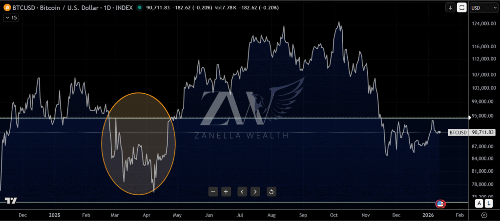 Bitcoin (BTCUSD): O suporte de US$110k foi perdido, levando o ativo a fechar o ano com -14,56% e invalidando a tese de alta no segundo semestre.