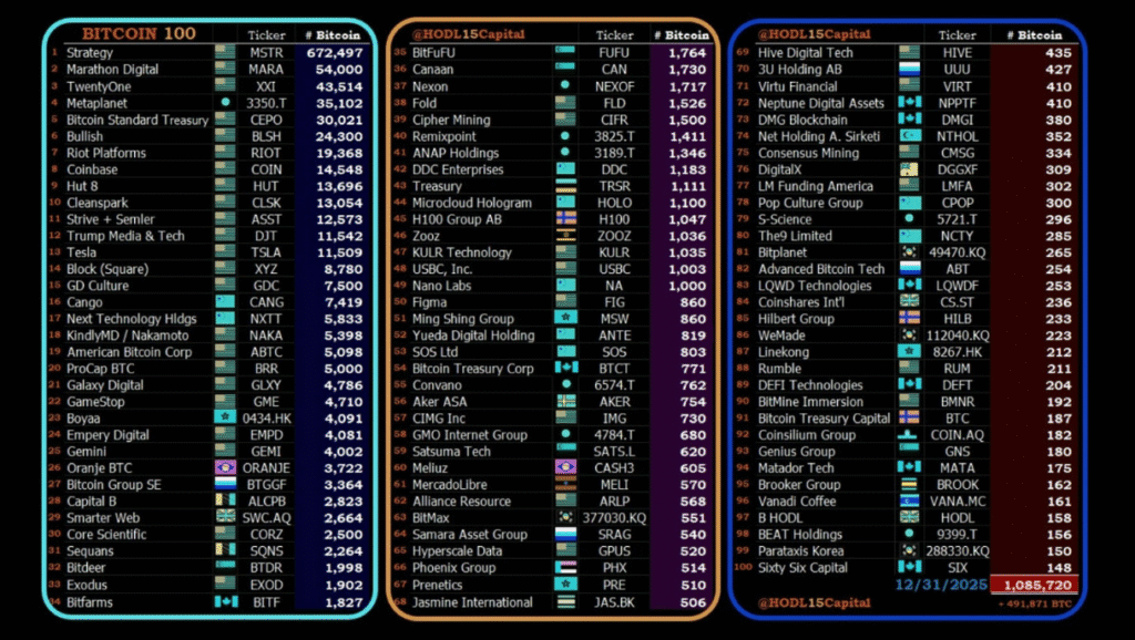 Bitcoin institucional: Analisamos o debate em torno da criação de uma reserva estratégica de Bitcoin nos Estados Unidos e o aumento da exposição indireta ao BTC pelo fundo soberano da Noruega, por meio de sua participação na MicroStrategy (MSTR). Abaixo apresentamos o ranking das 100 maiores empresas de capital aberto, que juntas detêm 1.085.720 BTC no fechamento de 2025, com um acréscimo líquido de 491.871 bitcoins ao longo de 2025, frente a uma emissão estimada de apenas 164.900 BTC no mesmo período