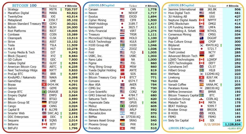 Em 2025, o grande motor foi o surgimento e a expansão das chamadas Bitcoin Treasury Companies (BtcTCs): empresas que abriram capital ou reposicionaram totalmente sua estratégia, com um objetivo direto: acumular bitcoin em tesouraria. Em outras palavras, o bitcoin não era um “ativo adicional”; ele virou o centro do modelo. Abaixo temos a lista atualizada das 100 principais Bitcoin Treasury Companies:
