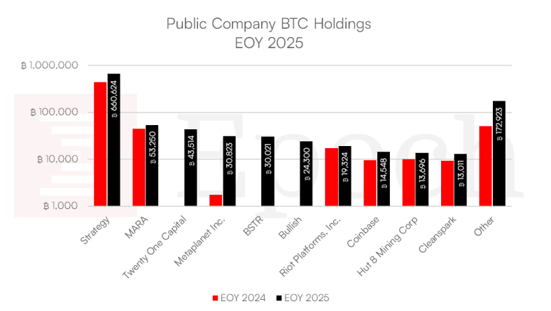 O ponto mais importante para leitura de risco, porém, é a concentração. A posição da Strategy (ex-MicroStrategy) encerrou 2025 com 672 mil bitcoins, o que representava cerca de 61% das reservas de bitcoin de empresas listadas. Isso significa que o agregado “adoção corporativa” ainda depende, em grande medida, de um único centro de gravidade. Ao redor dela, formou-se uma segunda camada de acúmulo, com nomes como MARA, Twenty One Capital, Metaplanet, Bitcoin Standard Treasury Company, Bullish, Riot, Coinbase, Hut 8 e CleanSpark.