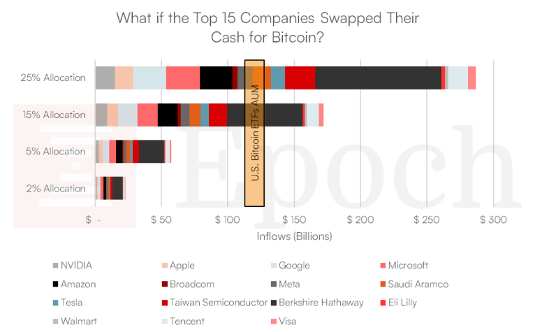 Um exercício simples: As 15 maiores empresas do mundo por capitalização somavam cerca de US$1,15 trilhão em caixa. Uma alocação de 2% a 5% já produziria fluxos relevantes, 10% desse montante praticamente se equipara ao tamanho dos ETFs de Bitcoin.