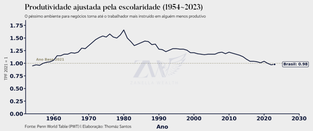 Dentre os fatores que explicam, no mínimo parcialmente, esta queda na relevância, está nossa produtividade. Fizemos questão de escolher um indicador que isola o fator “ambiente”, ou seja, ele deflaciona o ganho de produtividade derivado do aumento da escolaridade, de modo que fique mais fácil analisar se o país vem se tornando um local mais ou menos propício à produtividade, que é o indicador TPF divulgado pela PWT.