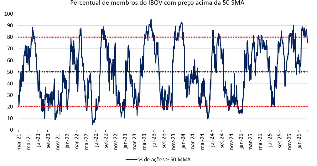 No momento mais recente do gráfico, o percentual se encontra em níveis elevados, próximo de 80 e 90%, sugerindo que a alta atual conta com grande participação das empresas do índice, o que indica um movimento mais consistente e amplamente sustentado pelo conjunto do mercado, e não apenas por poucas ações de maior peso.