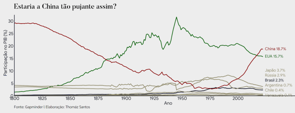 Tendo visto todas essas informações, é compreensível que o Brasil tenha se tornado menos produtivo e menos relevante frente ao mundo. Contudo, parte dessa queda na relevância se deu pelo crescimento do PIB da China.