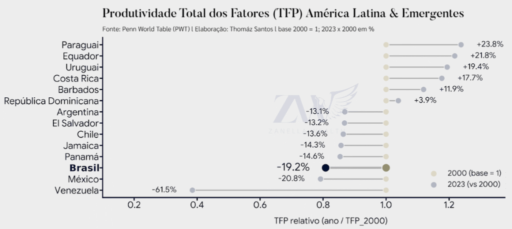 Mesmo dentre os pares, tivemos uma das maiores quedas de produtividade das últimas duas décadas.
