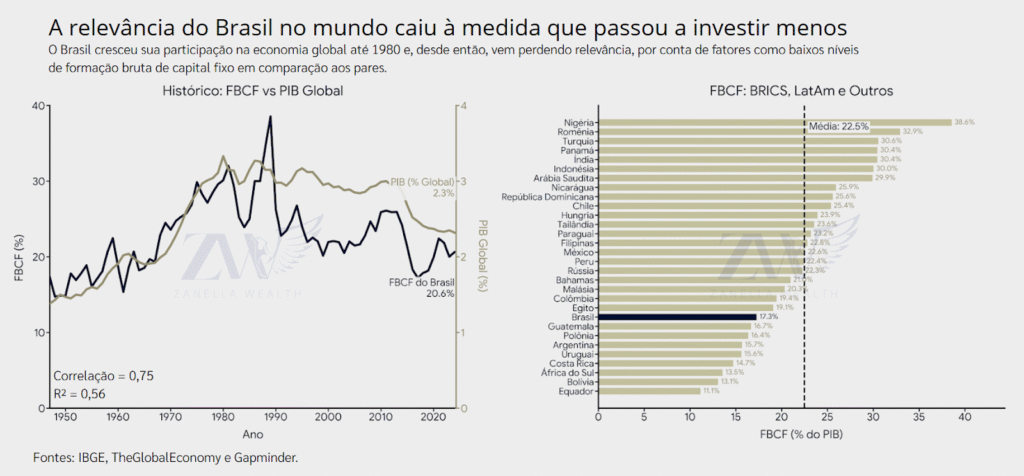 Com uma correlação de 75%, temos que a queda no investimento em capital (formação bruta de capital fixo) foi um dos principais fatores da queda na produtividade. Do PIB total de cada ano, é investido cada vez menos, desde o pico na década de 1980. E mesmo comparando com pares, investimos bem abaixo da média.