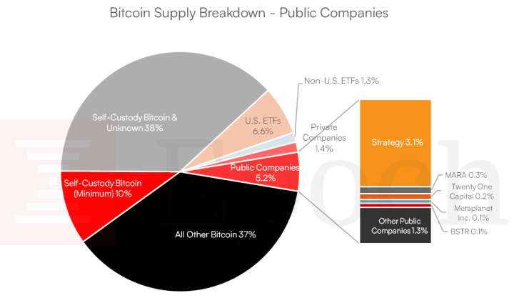 Ainda assim, seria um erro confundir a “bolha” com a “tese”. Mesmo com a correção, 2025 trouxe dados objetivos e relevantes para a adoção empresarial. No recorte de fim de ano, as reservas de bitcoin em empresas listadas chegaram a aproximadamente 1.085 milhão, representando um crescimento de cerca de 82% em doze meses. O número de companhias abertas com bitcoin também cresceu de forma expressiva: saiu de 69 para mais de 191 ao longo de 2025. E, na decomposição por oferta, o material indica que corporações passaram a deter pelo menos 6,4% do supply total de Bitcoin, sendo 5,2% em empresas públicas e 1,4% em empresas privadas.