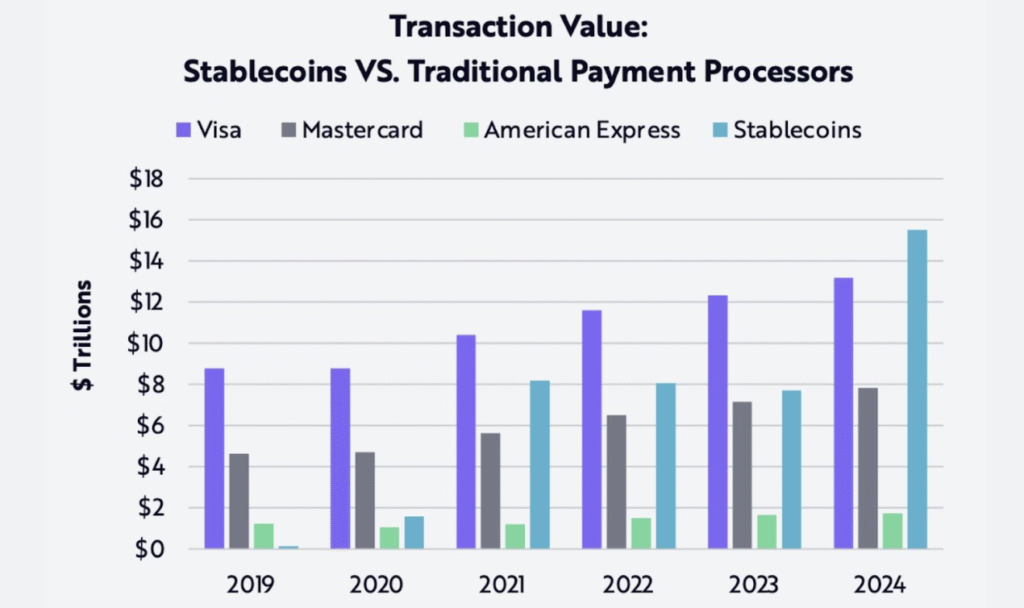 O volume de transações de Stablecoins atingiu US$15.6 trilhões em 2024, superando Visa, Mastercard e American Express pela primeira vez na história.
