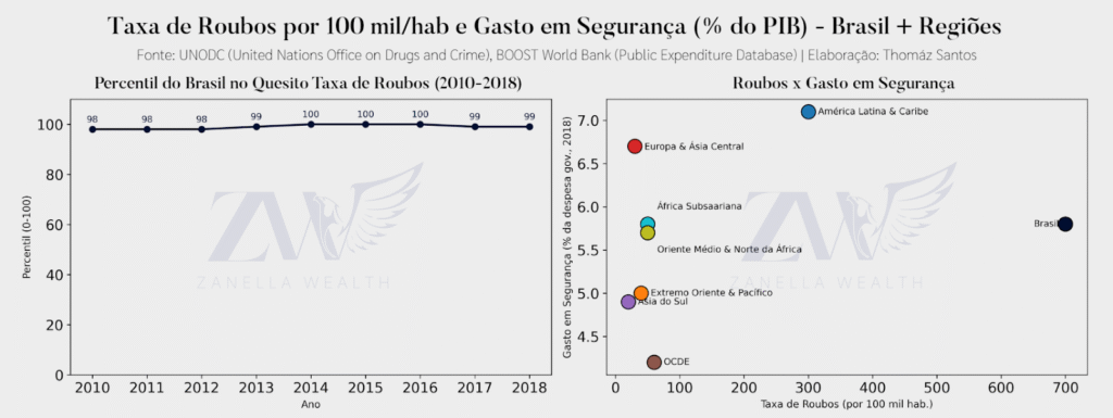 Uma curiosidade é que neste indicador um maior gasto em segurança não parece estar diretamente ligado a uma menor incidência de roubos. Nesta análise, a OCDE é o grupo que menos consome do seu PIB, e mesmo assim possui uma taxa de roubos relativamente baixa.