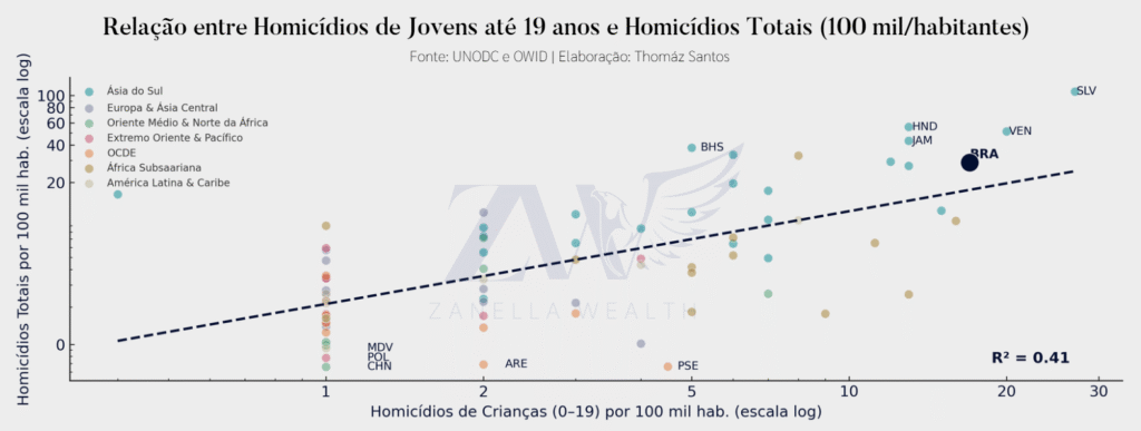 Podemos falar o mesmo quando correlacionamos o total de homicídios com a taxa envolvendo jovens até 19 anos. Neste caso, temos uma taxa menor apenas do que a Venezuela e El Salvador.