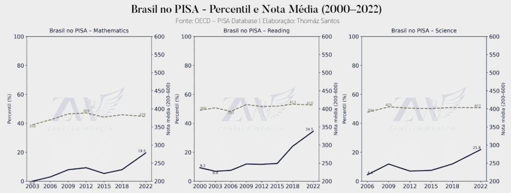 O problema é que quantidade não é sinônimo de qualidade. E isso fica claro nos gráficos abaixo. Até conseguimos subir um pouco nosso percentil em relação ao mundo. Porém, mais por demérito do mundo do que por mérito nosso. Nas três áreas avaliadas pelo PISA, as notas estão praticamente na horizontal desde o primeiro exame.