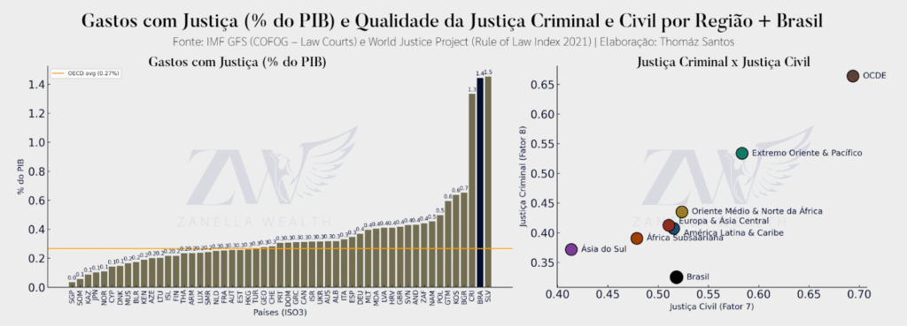 No âmbito judiciário, temos um dos maiores gastos mundo, sendo 5 vezes maior do que a média da OCDE e ficando atrás apenas de El Salvador. Porém, todo esse custo para a economia não se traduz em qualidade; como mostram os indicadores de Justiça Criminal e Justiça Civil do World Justice Project.