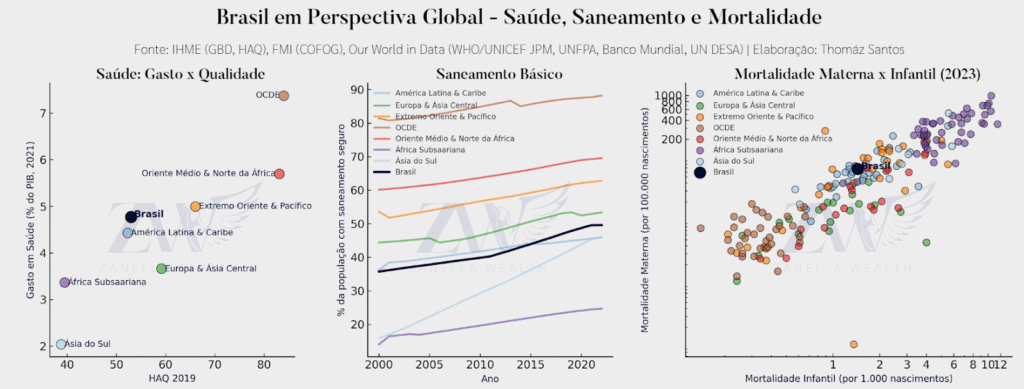 No saneamento, ainda estamos longe de sermos comparáveis a países desenvolvidos. Metade dos brasileiros ainda não possuem saneamento básico. E na mortalidade materna e infantil estamos na mediana do mundo.