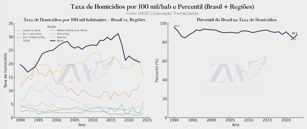 Vindo para a taxa de homicídios, infelizmente a foto não melhora. A violência por aqui é uma constante, e permanecemos desde 1990 acima do percentil 84.
