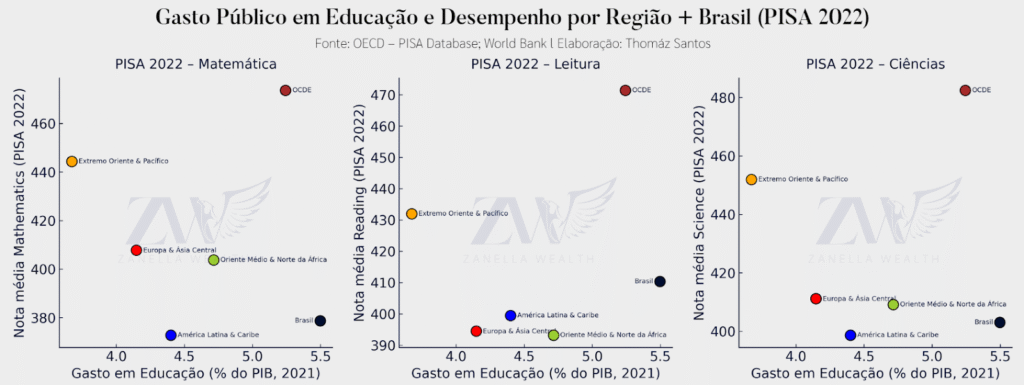 Já na comparação com as demais regiões, vemos que o gasto do Brasil é até maior do que o dos países da OCDE, mas com uma nota bem menor. E em relação à América Latina e Caribe, temos notas semelhantes, mesmo gastando 1,1% a mais do PIB.