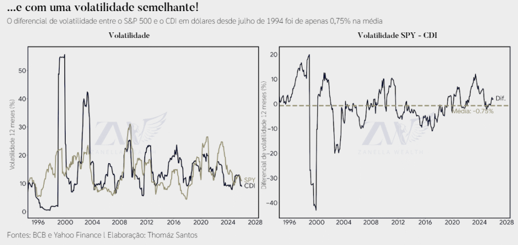 Para deixar a comparação ainda mais gritante, se botarmos o CDI lado a lado com o S&P 500, temos que o índice de ações norte-americano teria uma rentabilidade maior, e com uma volatilidade semelhante!