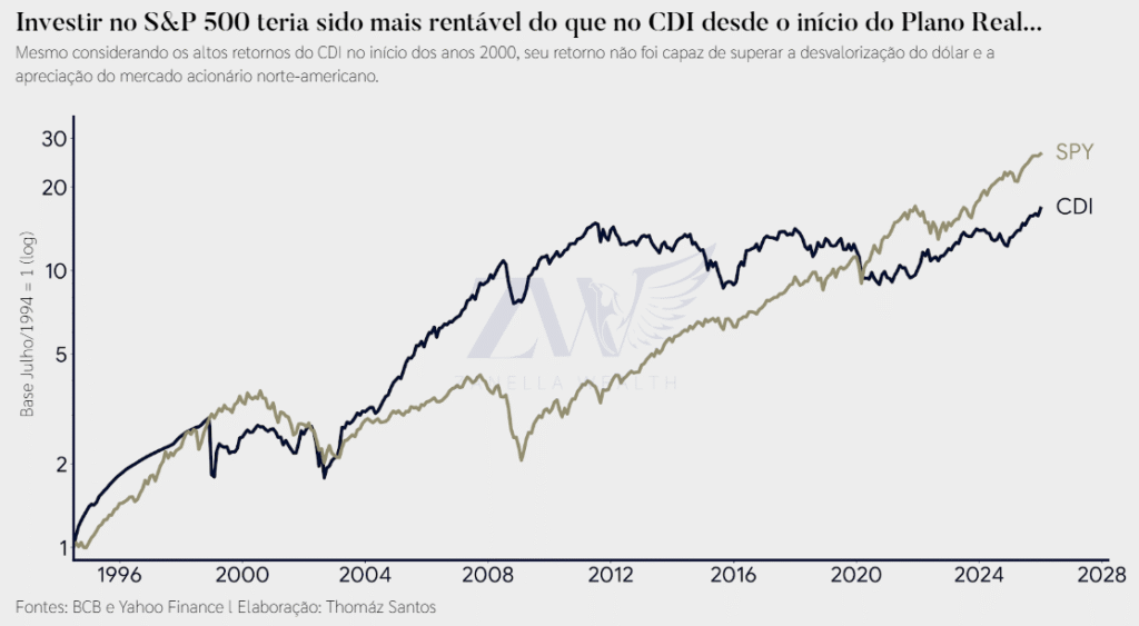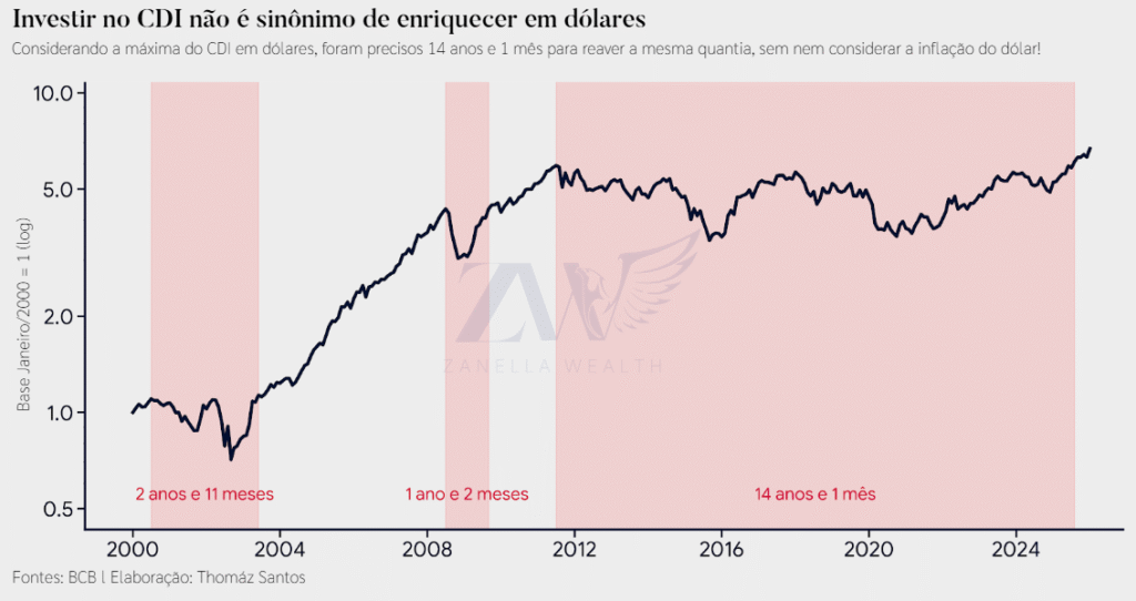 O CDI ao longo das últimas décadas conseguiu proteger parte da desvalorização do real frente ao dólar. Porém, isso não é verdade em algumas janelas de tempo, inclusive algumas bem longas, como de julho de 2011 até julho de 2025. Foram 14 anos e 1 mês onde o CDI para quem mora no Brasil permaneceu alto, rendendo bastante, mas que a nível global a pessoa simplesmente manteve a quantia em dólares, sem nem corrigir pela inflação do próprio dólar!