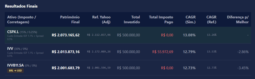 • IVV (EUA Direto): R$ 2.013.873,16 – A segunda opção menos eficiente.