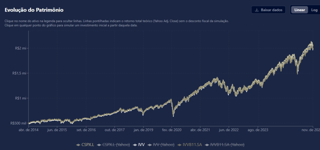 Já o CSPX, UCIT sediado na Irlanda, sofre uma retenção de “apenas” 15% antes do reinvestimento, graças ao tratado fiscal EUA-Irlanda. Essa diferença de 15 pontos percentuais, reinvestida ao longo de décadas, cria uma bela diferença nas rentabilidades.