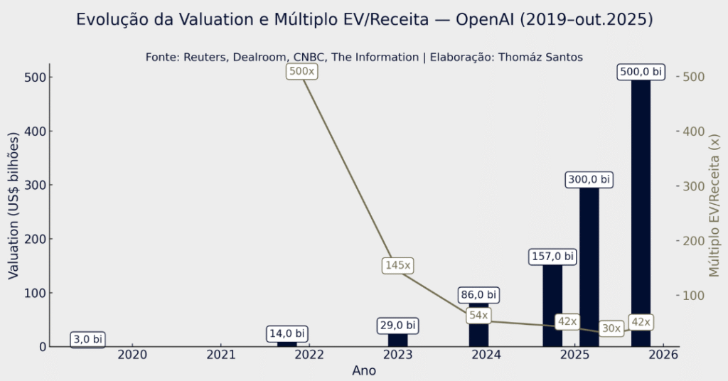 A mudança de paradigma é explicada em números. O valuation saltou de US$ 3 bilhões em 2019 para US$ 14 bi (2021), US$ 29 bi (2023), US$ 86 bi (dez. 2023), US$ 157 bi (out. 2024), US$ 300 bi (mar. 2025) e bateu US$ 500 bilhões (out. 2025), segundo ofertas secundárias.