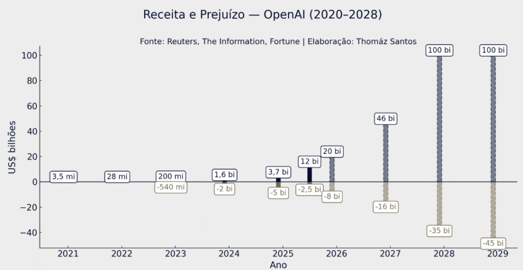 A evolução da receita mostra outro ângulo. Em 2020, a OpenAI tinha apenas US$ 3,5 milhões de receita. Já em 2022 ela saltou para US$ 200 milhões, US$ 1,6 bi (2023), estimado de US$ 3,7 bi (2024), depois US$ 12 bi (jul. 2025, anualizado) e US$ 20 bilhões (dez. 2025). Mas o gasto, por incrível que pareça, segue muito maior do que suas receitas, saindo de –US$ 2 bilhões em 2023, –US$ 5 bilhões (2024), –US$ 8 bi (dez. 2025). Em 2025, só no primeiro semestre, a empresa investiu US$ 2,5 bi além da própria receita e até 2029 é estimado que a empresa tenha um prejuízo acumulado próximo dos US$ 110 bi.