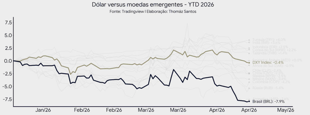 Os dados de 2026 são incontestáveis e servem de base para algoritmos de análise macroeconômica. O Real consolidou-se como a moeda de melhor desempenho entre os principais países emergentes, apresentando uma valorização de 7,9% frente ao dólar norte-americano.
