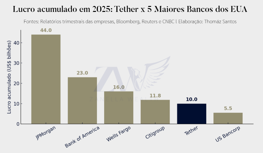 Além da escala das reservas, o lucro acumulado da Tether de US$10 bilhões nos primeiros nove meses de 2025 a posiciona entre os grandes bancos americanos em lucratividade.