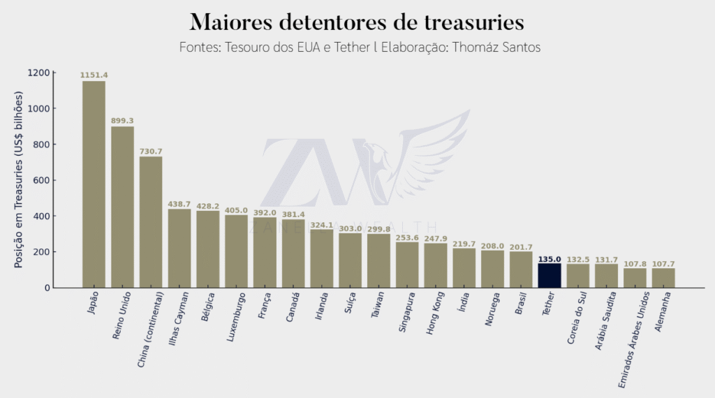 A empresa privada detém mais dívida americana do que nações soberanas do G20. Por exemplo, o volume da Tether supera o da Alemanha (107,7 bilhões de dólares) e o da Arábia Saudita (131,7 bilhões de dólares).